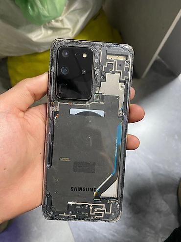 Samsung Galaxy S20 Ultra (SM-G988) — смартфон с прозрачной задней крышкой (видна внутренняя компоновка) и модулем основной камеры 108 MP + телефото + сверхширик, вспышка. На задней панели маркировка Samsung, шлейф беспроводной зарядки и катушка NFC. Спереди — безрамочный дисплей с тонкими рамками, фронтальная камера в центре (вырез в экране). Разъёмы и элементы: