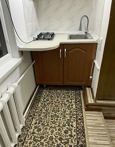 - Кухонная зона: компактный модуль с мойкой и смесителем, варочная панель на 2 конфорки, настенная плитка, напольный ковровый дорожник, рядом окно и радиатор отопления.