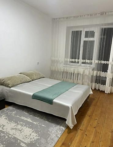 - Спальное место: двуспальная кровать, комплект подушек, покрывало; светлые стены, большие окна с тюлем, деревянный пол, прикроватная тумба, ковёр.