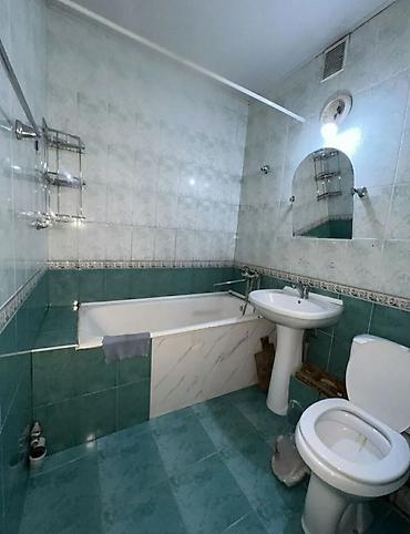 - Санузел раздельный с ванной комнатой: ванна стандартного размера, раковина на пьедестале, зеркало и полочки, унитаз; стены и пол облицованы плиткой, есть вытяжка и место под стиральную машину.