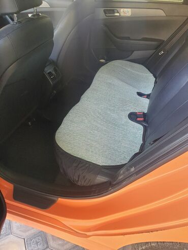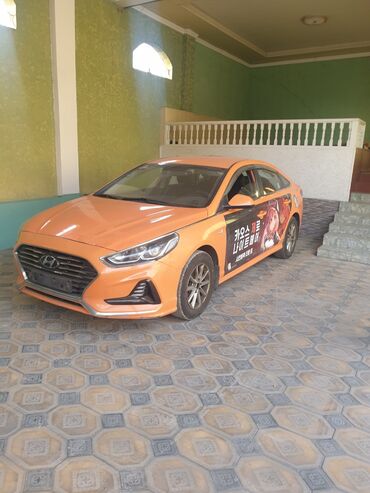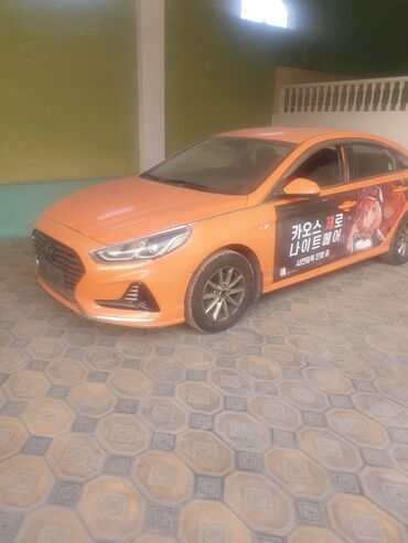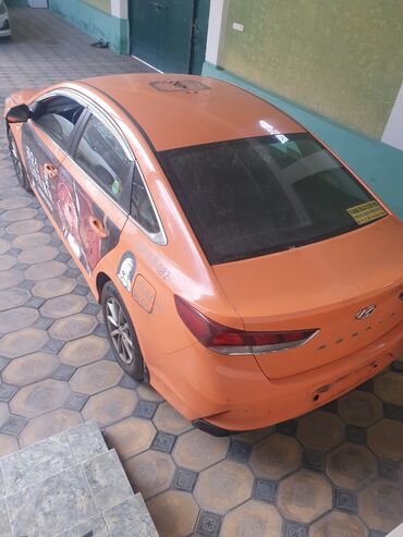 Hyundai Sonata седан, оранжевый цвет, рестайлинг с фирменной решёткой каскадного типа и узкими светодиодными ДХО. Кузов — 4 двери, 5 мест. Легкосплавные диски, зеркала и ручки в цвет кузова, хромированная окантовка окон. Передний и задний бамперы с черными вставками и противотуманными фонарями. На бортах — виниловая рекламная графика (аниме/корейские надписи). Задние фонари светодиодные, шильдик Sonata. Подготовка под номерные рамки спереди и сзади. Панорамный люк/крыша с заглушкой на месте механизма. Салон тёмный, передние сиденья с подголовниками, многофункциональный руль. Электропакет стёкол и зеркал. Климатическая система, центральный дисплей (по центру торпедо). Парктроники в заднем бампере. Антенна «акулий плавник». Хорошо подходит для города и трассы: просторный салон и вместительный багажник.