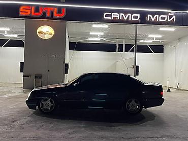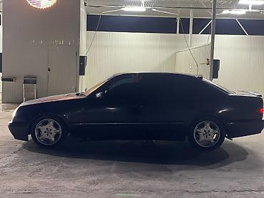 Mercedes-Benz E‑Class (W210) седан, дорестайлинг. Темно‑серый цвет, 4 двери, тонированные стекла по кругу. Фирменные пятиспицевые легкосплавные диски Mercedes, низкая посадка/заниженная подвеска, фирменные молдинги и хромированные ручки. Передняя оптика – овальные фары первого поколения W210, задние фонари классической формы. Боковые повторители, накладки порогов, эмблемы Kompressor на крыльях. Двойной выхлоп, аккуратные хром‑вставки по периметру остекления.