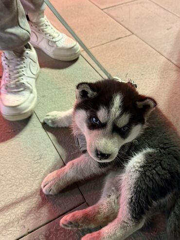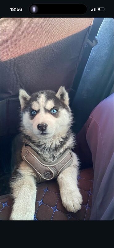 Щенок хаски с яркими голубыми глазами. Окрас черно-белый с контрастной маской на морде. Компактный, пушистый, с плотной двойной шерстью. На фото — в мягкой шлейке серого цвета с анатомической посадкой.