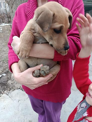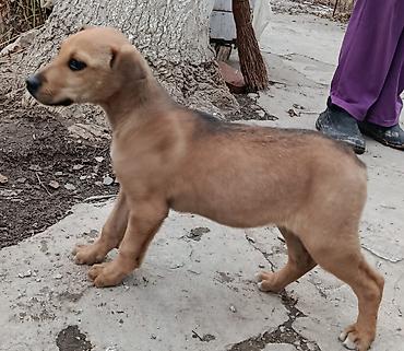 Щенок метис, возраст примерно 2–3 месяца. Окрас рыжий с тёмной «накидкой» по спине, чёрная маска на мордочке. Крепкий костяк, крупные лапы — вероятно, вырастет средним или крупным. Уши полустоячие, шерсть короткая, плотная, легко ухаживать. Хвост средней длины.