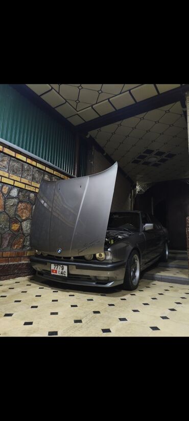 BMW 5 Series E34, седан, бордовый металлик. Ключевые особенности: - Классический кузов E34 с фирменной «двухглазой» оптикой и округлыми ПТФ в бампере. - Аэродинамический передний спойлер/лип на шт...