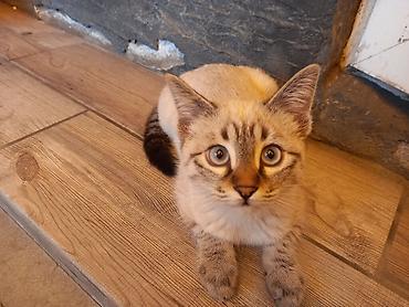 Котёнок с голубыми глазами и выразительной «маской» на мордочке. Окрас: кремово-бежевый с тёмными табби-полосами, уши и хвост более тёмные, лапки серо-подпалые. Шерсть короткая, мягкая, с заметным градиентом от светлой спины к более тёмной мордочке и хвосту. Глаза крупные, светло-голубые. Нос тёмный, очерченные «стрелочки» у глаз. Хвост пушистый, с контрастным тёмным кончиком. Уши большие, с тёмными краями и светлой «внутренней» шерсткой. Компактное телосложение, аккуратные круглые лапки.