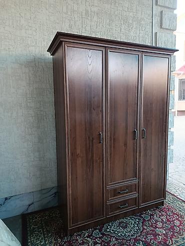 Трехдверный шкаф для одежды из ЛДСП с отделкой под тёмное дерево.