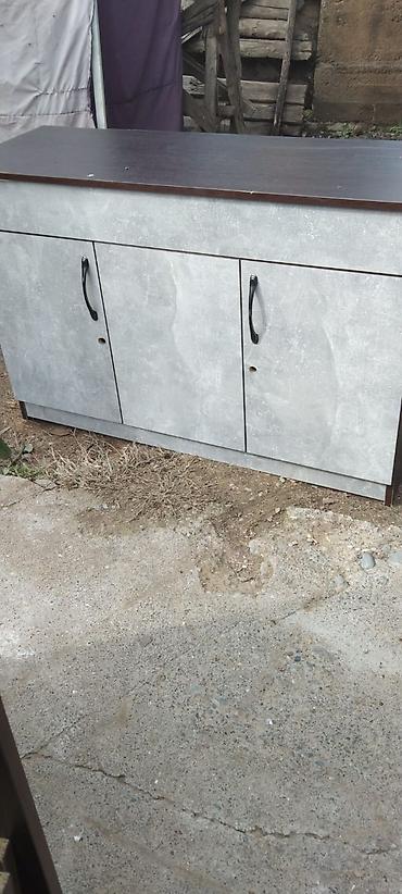 - Комод/тумба: три распашные двери с черными ручками; широкая верхняя столешница темного цвета.