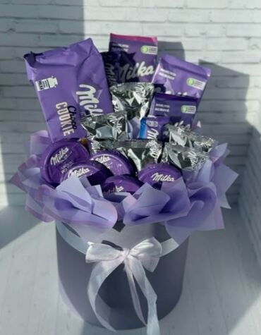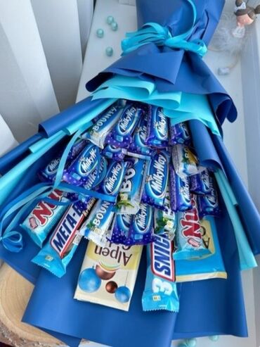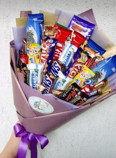 - Авторские букеты из популярных сладостей: Kinder Bueno, KitKat, Oreo, Snickers, Mars, Milky Way, Bounty, Picnic, Alpen Gold, Milka и др.