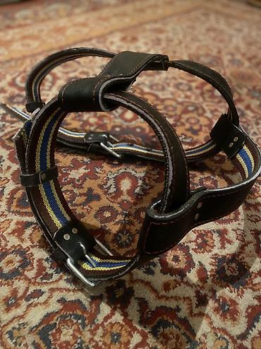 Размер: регулируемый, ориентирован на собак с широкой грудью. Цвет: чёрная кожа, стропы с контрастными полосками.