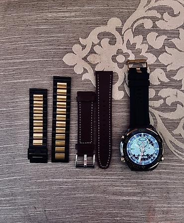 - сменные ремешки: черный силиконовый с классической пряжкой, коричневый кожаный с контрастной строчкой, металлический браслет (двухцветный – черный/золотистый) с дополнительным звеном