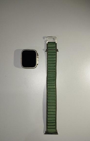 Смарт-часы в корпусе формата “ультра” с боковой заводной кнопкой и дополнительной клавишей. Комплект: часы и ремешок-лента зеленого цвета с регулировкой и металлическими креплениями.