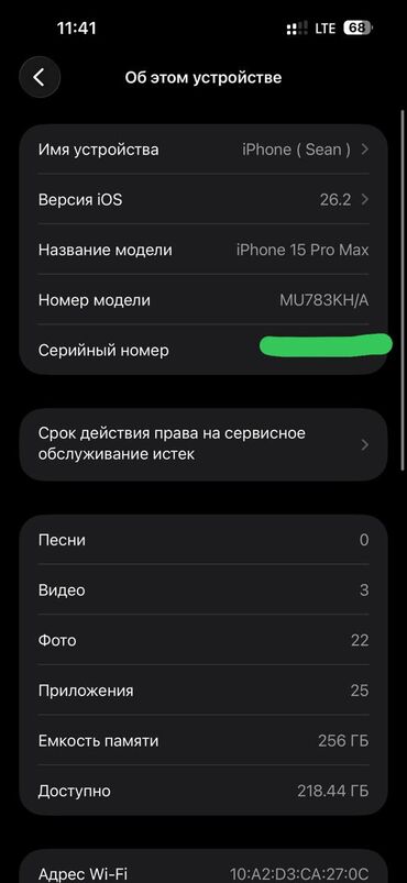 IPhone 15 Pro Max, 256 ГБ Характеристики и детали: - Модель: iPhone 15 Pro Max (номер модели MU6R3J/A, серийный номер виден на фото настроек) - Память: 256 ГБ, свободно ~70,45 ГБ - Цвет корпуса: с...