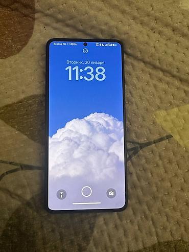 POCO смартфон с блоком из 4 камер и надписью 50MP OIS. Тыльная панель темно‑серая, с фактурным покрытием. Модуль камер крупный, с тремя объективами и вспышкой, окантовка объективов металлического цвета. На фронтальной стороне — безрамочный экран с центральным отверстием под селфи‑камеру. Дисплей поддерживает режим с вырезом по центру, статус‑бар показывает работу двух SIM (Beeline KG и MEGA), индикаторы 4G/VoLTE, Wi‑Fi, Bluetooth, NFC и уровень батареи. Интерфейс — фирменная оболочка POCO/MIUI с экраном блокировки и быстрым доступом к фонарику и камере.