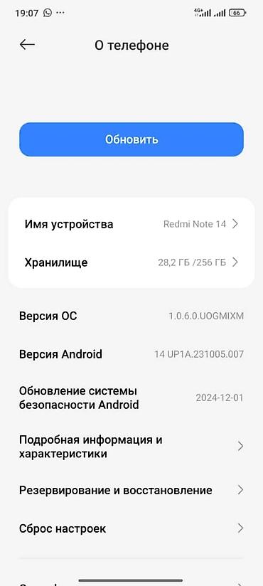 Смартфон Redmi Note 14, голубой. Характеристики и детали по фото: - Память: 256 ГБ (доступно около 76 ГБ из коробки). - Операционная система: Android 14, версия прошивки 1.0.7.0 UOGMIXM. - Обновле...
