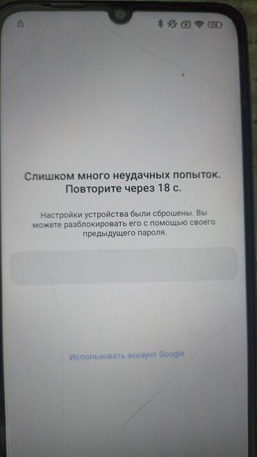 На экране при включении отображается сообщение: «Слишком много неудачных попыток… Настройки устройства были сброшены. Вы можете разблокировать его с помощью своего предыдущего пароля. Использовать аккаунт Google».