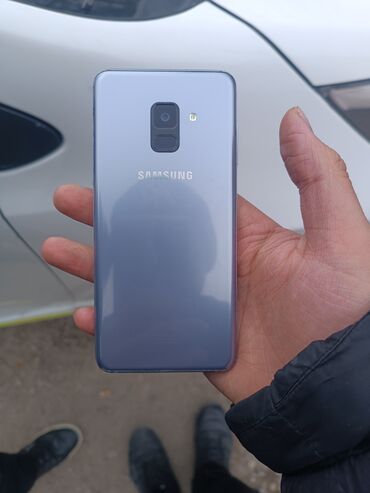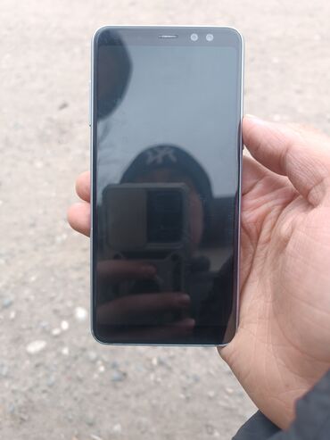 Samsung Galaxy A8 2018 Смартфон с большим безрамочным экраном около 6" (соотношение сторон вытянутое), фронтальная панель с тремя датчиками/фронтальной камерой и разговорным динамиком сверху. Кнопка питания и регулировки громкости на боковой грани. Корпус тонкий, с закруглёнными углами, цвет – тёмно‑серый/чёрный.