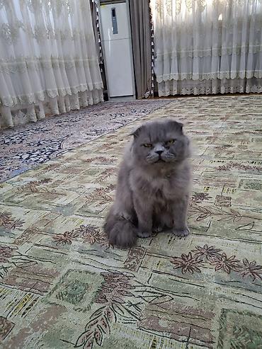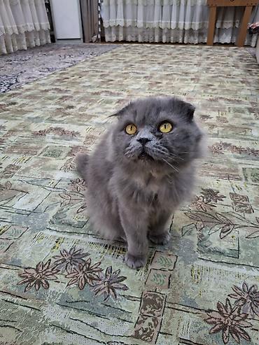 Шотландская вислоухая кошка, окрас: голубой (серый). Пушистая полудлинная шерсть с плотным подшёрстком, выразительные янтарные глаза. Уши аккуратно прилегающие, мордочка круглая, хвост пушистый, компактное телосложение.