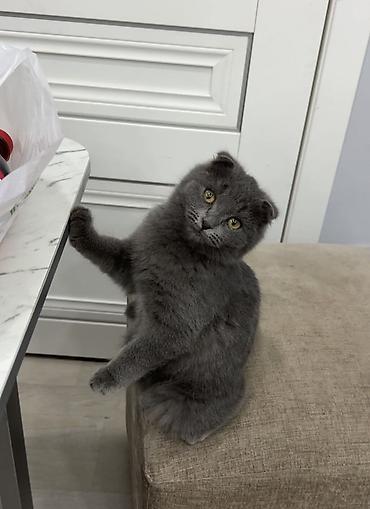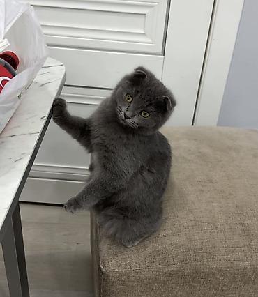 Шотландский вислоухий котёнок, окрас сплошной голубой. Плюшевая густая шерсть, компактное тело, округлая мордочка, аккуратные плотно прилегающие ушки. Глаза янтарные, выразительные. Котёнок общительный, ориентирован на человека, любит сидеть рядом и с интересом наблюдать за всем, что происходит. Легко привыкает к дому, аккуратен, пользуется лотком, подходит для содержания в квартире. Рацион — качественный готовый корм/влажные паучи; хорошо переносит расчёсывание. Прекрасно уживается с детьми, игривый, но ненавязчивый. Идеален как компаньон: ласковый, уравновешенный характер, аккуратные повадки.