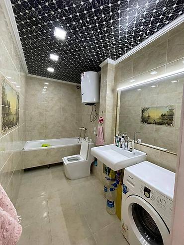 - Санузел совмещенный: ванна, унитаз, умывальник с зеркалом и подсветкой, водонагреватель, место и выводы под стиральную машину (машинка установлена на фото), облицовка керамогранитом.