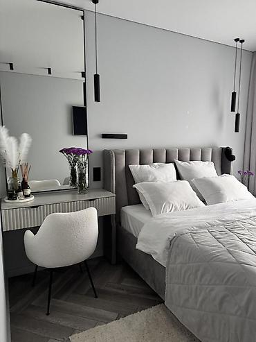 - Спальня: мягкая двуспальная кровать с высоким велюровым изголовьем, комплект подушек и легкое стеганое покрывало. Подвесные цилиндрические светильники по бокам, прикроватные розетки и выключатели. Туалетный/рабочий столик с рифленым фасадом и широким зеркалом во всю стену, уютное кресло-«шарпей» на металлических ножках. Плотные шторы в тон стенам.