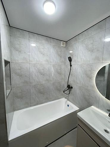 - Ванная: облицовка крупноформатной плиткой, акриловая ванна стандартного размера, настенное душевое оборудование, ниша в стене для косметики, круглая зеркало-подсветка, тумба с умывальником.