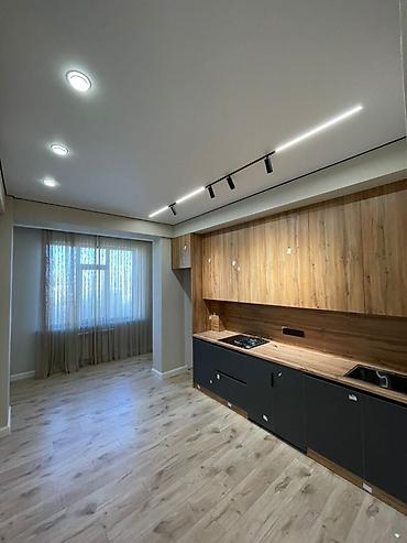 - Освещение: комбинированное — трековые светильники и линейная LED-подсветка на кухне, точечные светильники по периметру, настенные бра в комнате, центральная дизайнерская люстра.