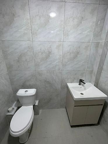 - Санузел: унитаз, умывальник с тумбой, стены и пол — керамогранит нейтральных оттенков.