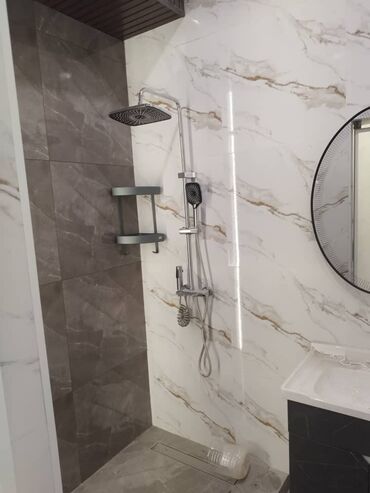 Совмещённый санузел/душевая с бытовой техникой и оборудованием. - Отделка: крупноформатные панели под мрамор с золотистыми вставками, потолок с точечным освещением и вытяжкой. - Душевая зона: прип...