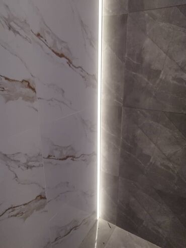 - Встроенная вертикальная LED‑подсветка в углу душевой, мягкий равномерный свет.