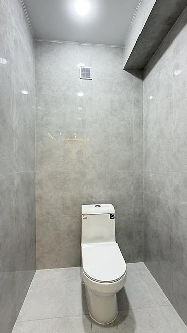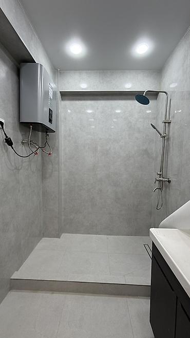 - Санузел: душевая зона в едином уровне с подиумом и уклоном к трапу, крупноформатная керамогранитная плитка серого цвета, верхний и ручной душ, гигиенический душ, ниша под сантехнику; точечное LED‑освещение; установлен электрический водонагреватель; тумба с умывальником и столешницей.