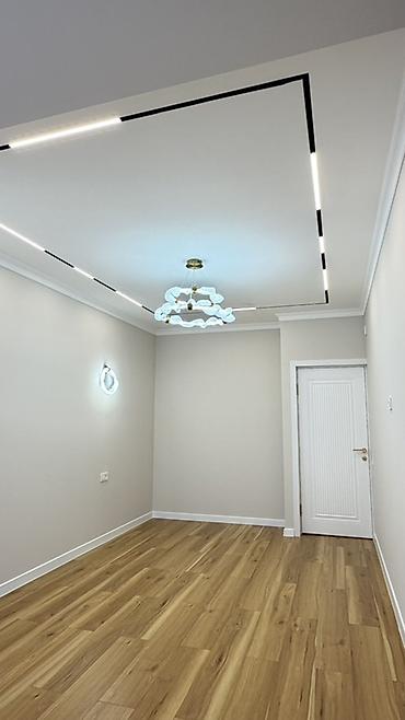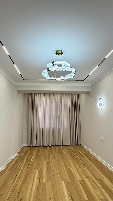 - Потолок: многоуровневый с врезными трековыми/линейными LED‑светильниками и декоративной подвесной люстрой с латунными акцентами; настенный светильник в том же стиле.