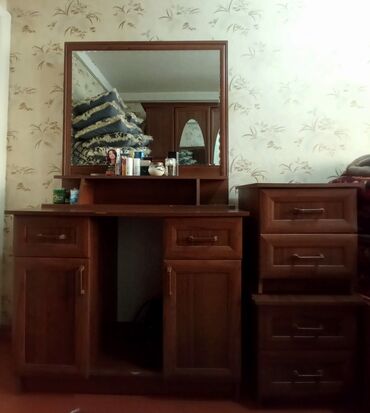 - Туалетный столик с большим зеркалом. Столешница с надстройкой и открытыми полочками, по бокам — выдвижные ящики и распашные тумбы; центральная ниша для стула.