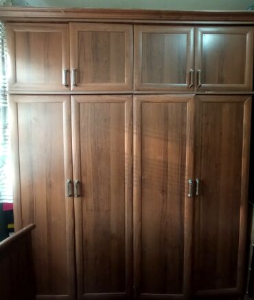- Трёхсекционный шкаф для одежды с надставками. Высокий, с распашными дверями; верхний ярус — антресоли для сезонных вещей. Металлические ручки, фасады с филёнками.