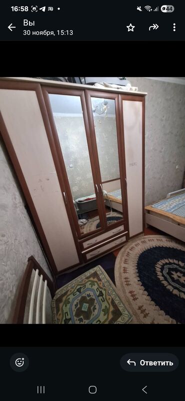 - Трёхдверный шкаф-купе распашного типа: две глухие створки и центральная створка с большим зеркалом во весь рост. В нижней части – два выдвижных ящика с ручками-скобами.