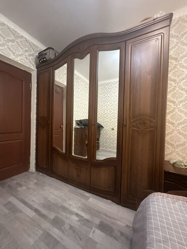 - Большой трёхстворчатый шкаф с центральными зеркальными фасадами и двумя боковыми секциями; фигурный карниз, резные накладки. Внизу — выдвижные ящики/панели цоколя.