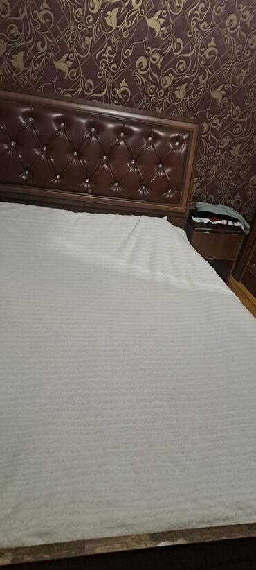 - Двуспальная кровать с высоким мягким изголовьем каретной стяжки (обивка под кожу с декоративными пуговицами). Основание под матрас, борта из массива/ЛДСП в тон.