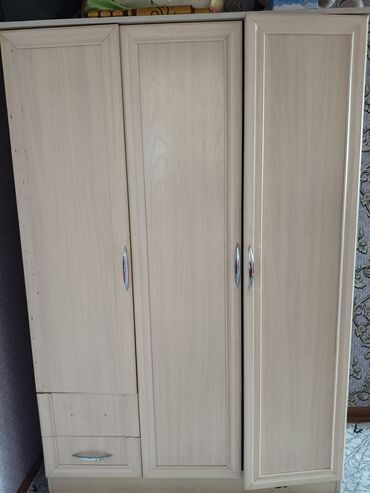 - Трёхстворчатый шкаф для одежды с распашными дверцами, металлическими ручками и нижними выдвижными ящиками. Внутри — отделения для вешалок и полки (видны крепёжные отверстия для регулировки).