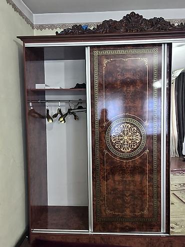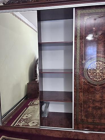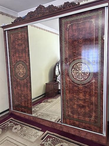 - Шкаф-купе трехдверный с зеркальной центральной створкой. Фасады с орнаментом и резным карнизом.