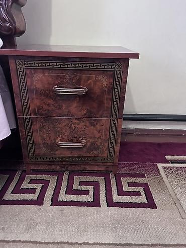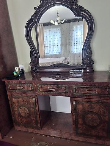 - Туалетный стол/комод с большим фигурным зеркалом. Столешница под мрамор/шпон, декоративная резьба. Три верхних выдвижных ящика, две боковые тумбы с дверцами. Эргономичное открытое пространство по центру для кресла/пуфа.