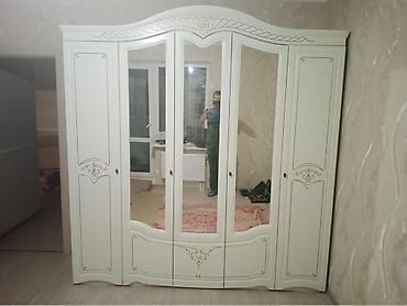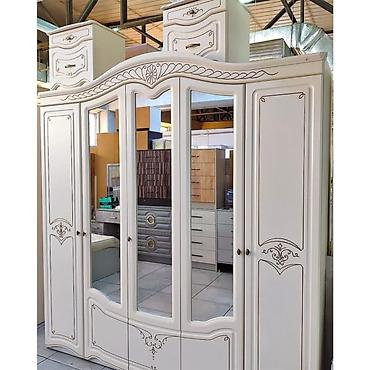 - Шкаф пятидверный с центральными зеркалами. Внутри — секции с полками и штангами для вешалок, нижние ящики/ниши для хранения. Боковые отделения — полочные, центральные — комбинированные.