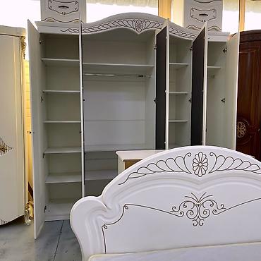 Спальный гарнитур в классическом стиле с изящной резьбой и золотистым декором.