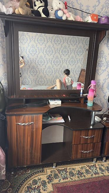 - Туалетный столик с большим настенным зеркалом: широкая столешница с фигурным вырезом, открытые полочки под зеркалом, тумба с дверцей слева, ниша по центру, справа — выдвижные ящики; декоративные металлические опоры.