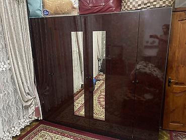 - Четырехдверный платяной шкаф из темного глянцевого материала с двумя зеркалами по центру. Внутри секции с полками и отделениями для хранения.
