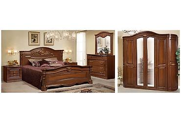 Спальный гарнитур в классическом стиле, оттенок тёплый орех, резные фасады и фигурная фурнитура под бронзу.