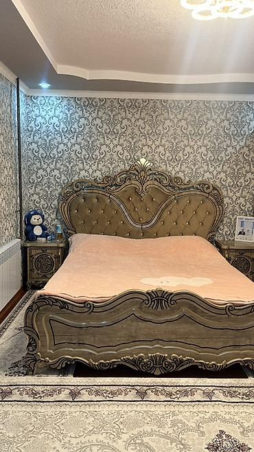- Двуспальная кровать с высоким мягким изголовьем, каретная стяжка с декоративными пуговицами, фигурное изножье с резьбой.