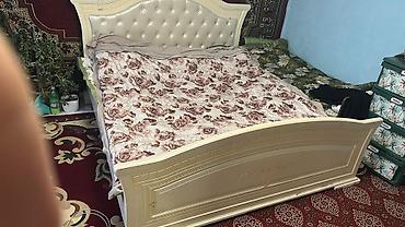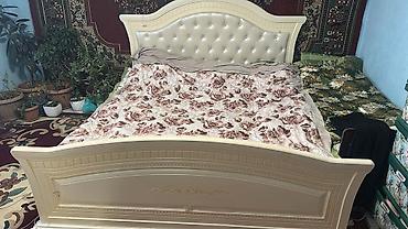 - Кровать двуспальная с высокой мягкой изголовной спинкой, обтянутой светлой экокожей с декоративной стёжкой-«каретной» утяжкой и пуговицами. Изножье и изголовье с фигурными боковинами и рельефным декором под резьбу.