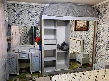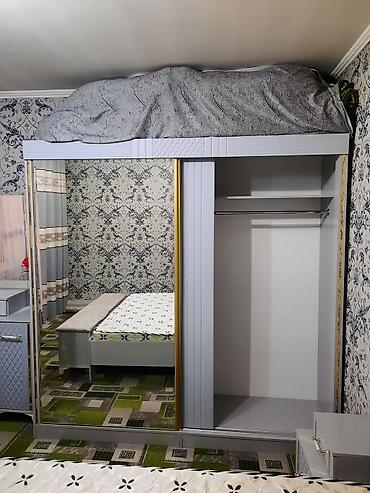 - Шкаф‑купе с зеркальной раздвижной дверью: отделение с штангой для плечиков и полками для сложенных вещей; снаружи — большое зеркало во всю дверь.