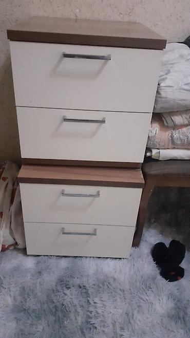 - Две прикроватные тумбы по 2 выдвижных ящика каждая. Фасады светлые, верх под дерево, металлические ручки.