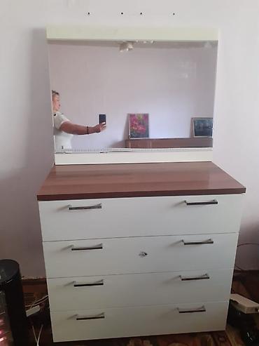 - Комод с 4 выдвижными ящиками и большим зеркалом. Верхняя столешница под дерево, фасады светлые, металлические ручки.